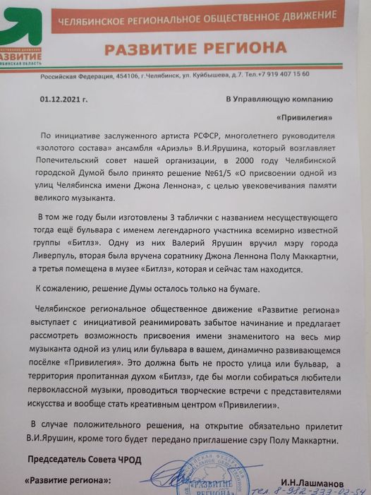 Проект «Назовём улицу в Челябинске именем Джона Леннона»